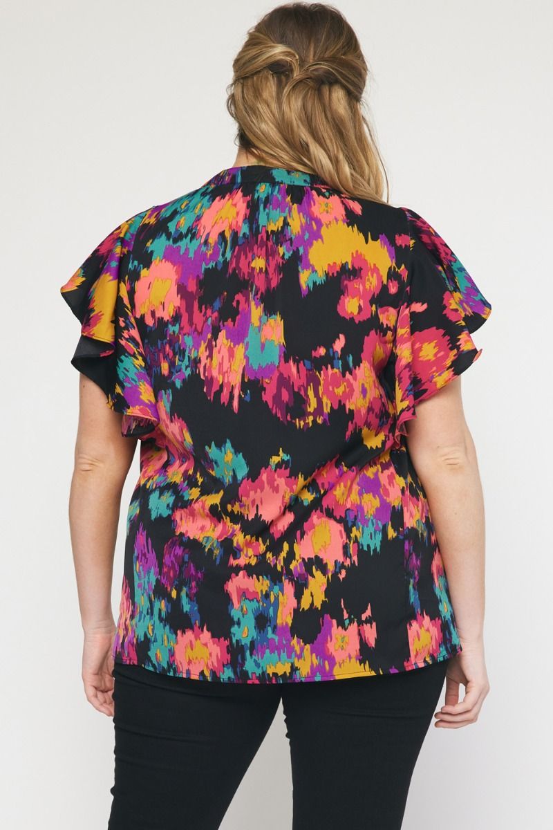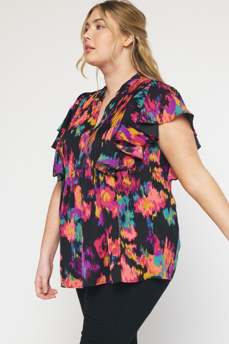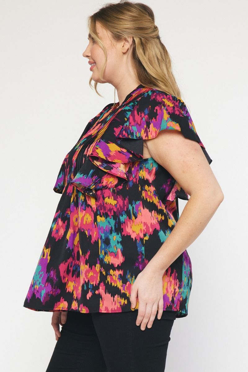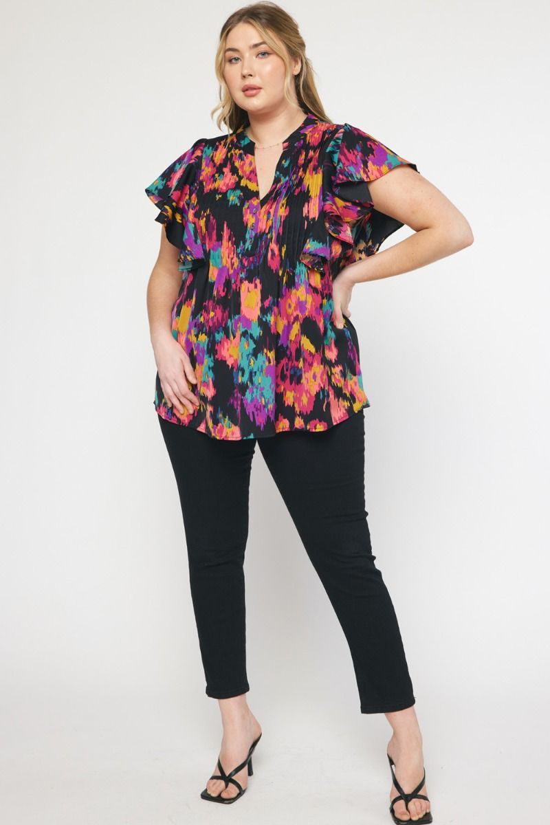 The Eye Kat Pleated Front Ruffle Sleeve Top Curve +