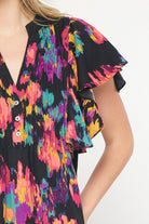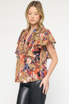 Elevate your wardrobe with the Eye Kat Pleated Front Ruffle Sleeve Top! The pleated sleeve adds a touch of sophistication, while the bold pattern and ruffle sleeve detail make a statement. With a flattering v-neck, this top will make you feel confident and stylish all day long!