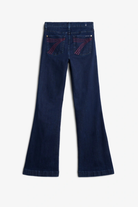 Fits like: Fitted through the hips and thighs. This mid rise denim has a wide, full-length leg and a subtle flare for a long, lean silhouette.