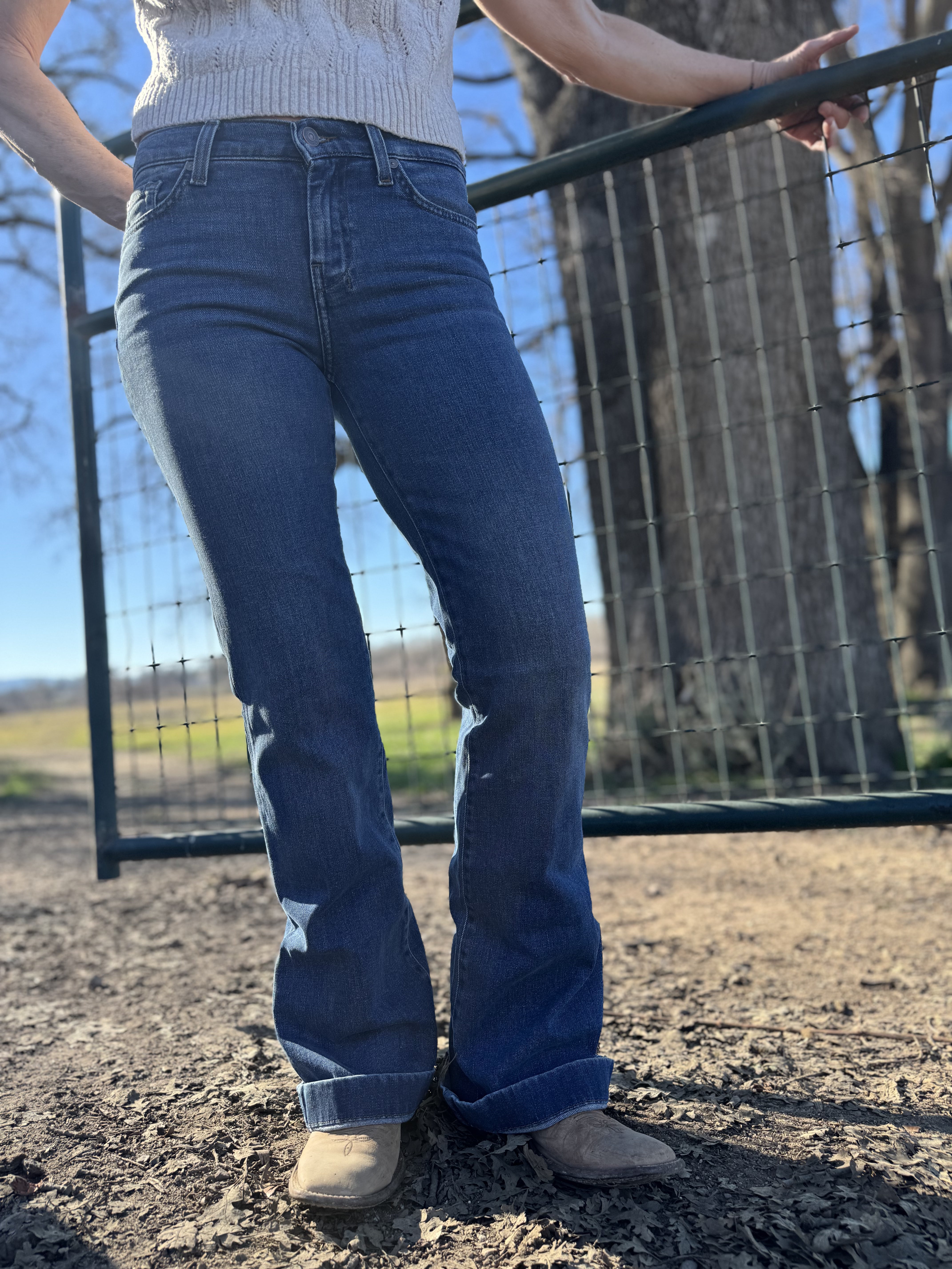 Fits like: Fitted through the hips and thighs. This mid-rise denim has a wide full-length leg and a subtle flare for a long, lean silhouette.