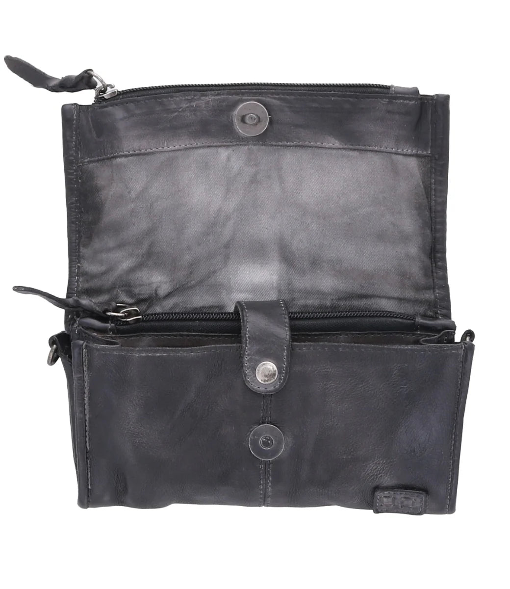 Amina redefines versatility and sophistication with its sleek design. This essential accessory seamlessly transitions from a compact crossbody to a clutch and wallet, offering convenience with its dual straps, built-in card slots, cash pockets, and secure snap closure. Complete with a magnetic flap and adorned with braided leather zipper pulls.