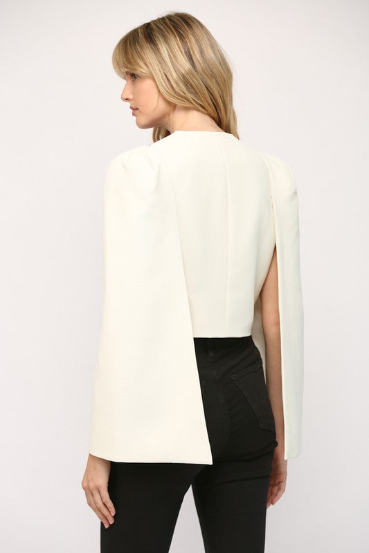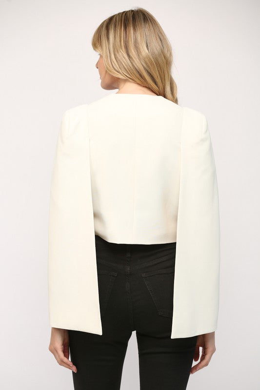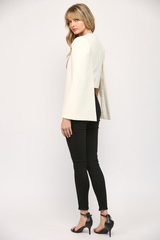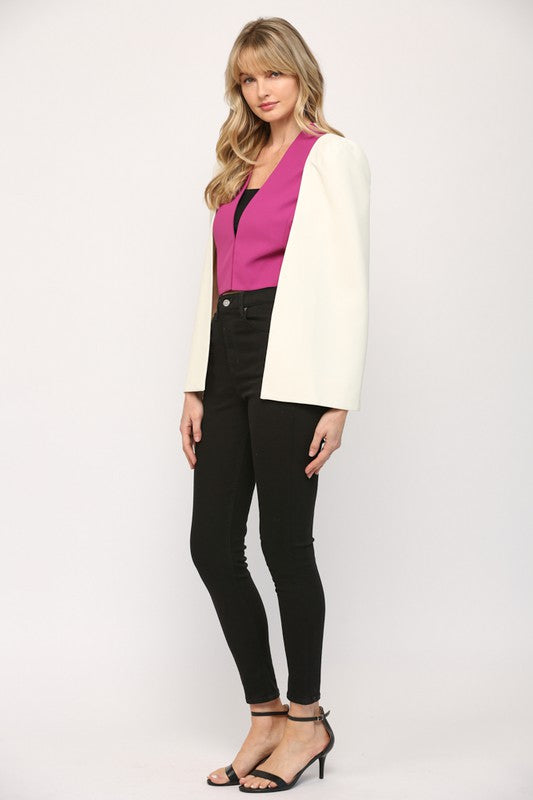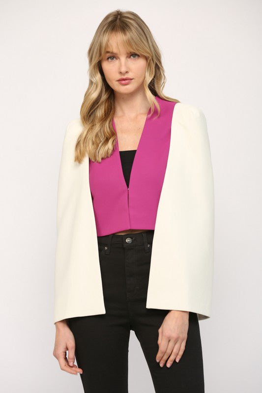 Elevate your wardrobe with the Lex Kat Cloak Sleeve Crop Blazer! Its cape sleeve design combined with the block pink and white color scheme create a unique and stylish look. Stand out from the crowd and make a statement with this one-of-a-kind blazer!