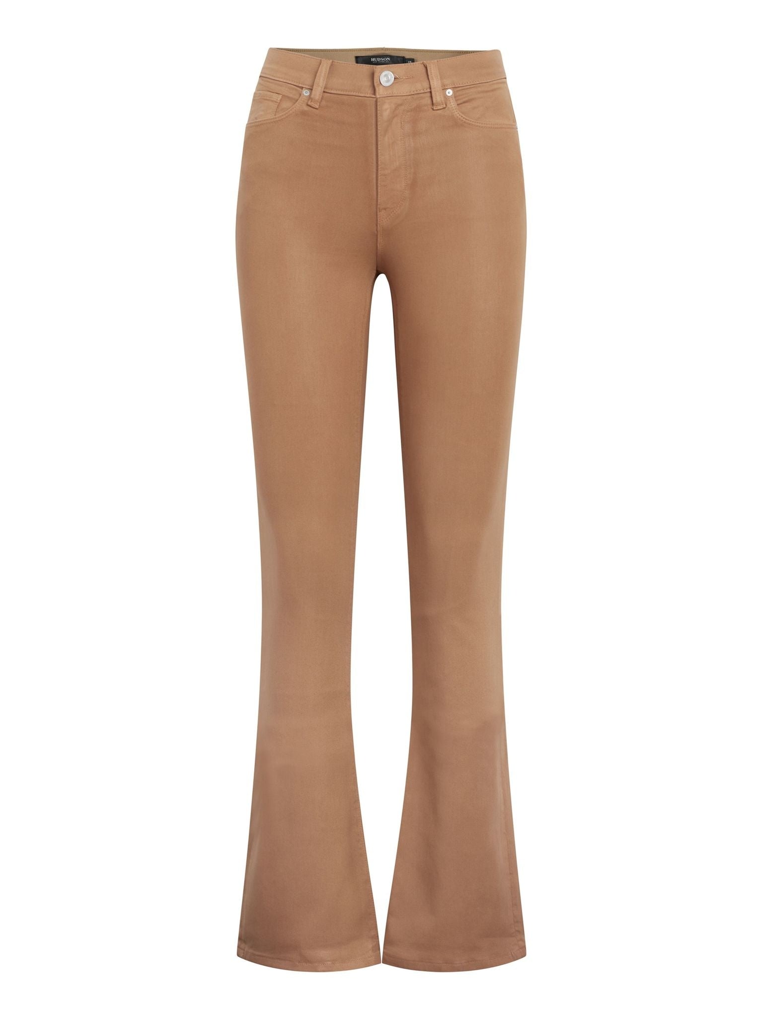 The Barbara High-Rise Bootcut in Coated Tobacco Brown flatters with a streamlined silhouette and elevated waistline. The slim, contoured fit and gently flared leg provide comfortable wear. Crafted from a coated cotton blend, it offers a sophisticated touch to your classic five-pocket jean.