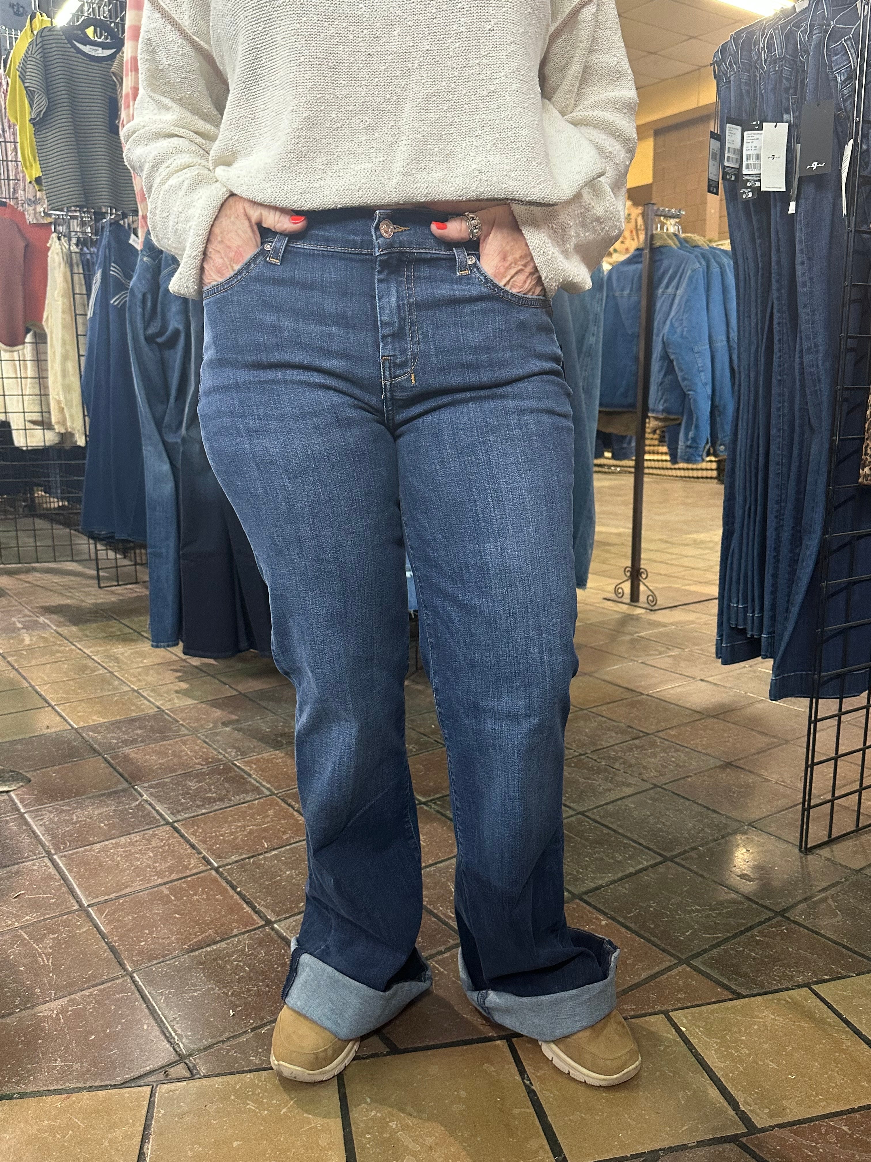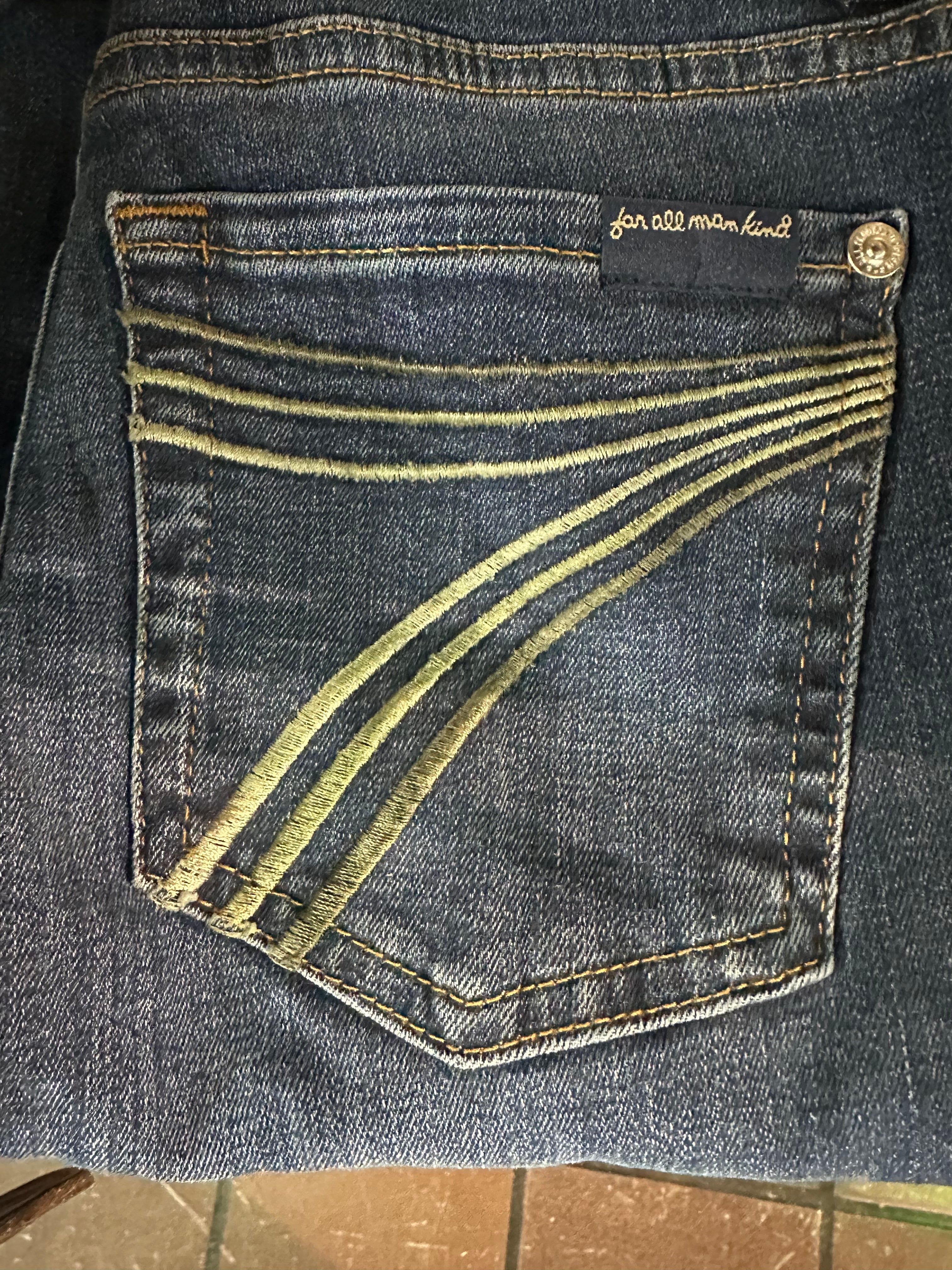 The Dojo in Boxford jeans offer a perfect mix of comfort and style with their smooth dark blue denim. Highlighted by a distinctive ombre sage green "7" on the back pocket, they add just the right touch of color while maintaining a clean, polished look with no distressing.