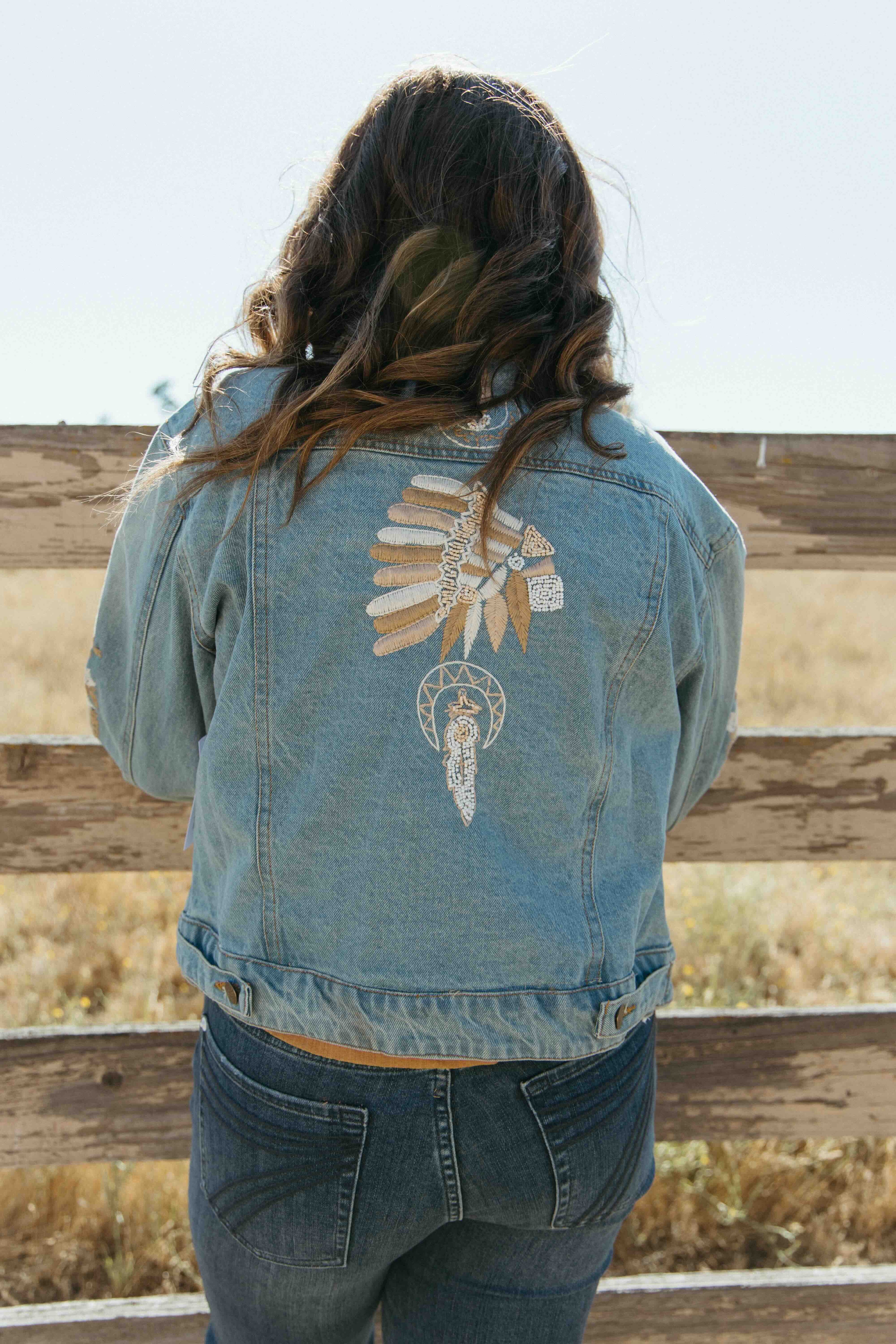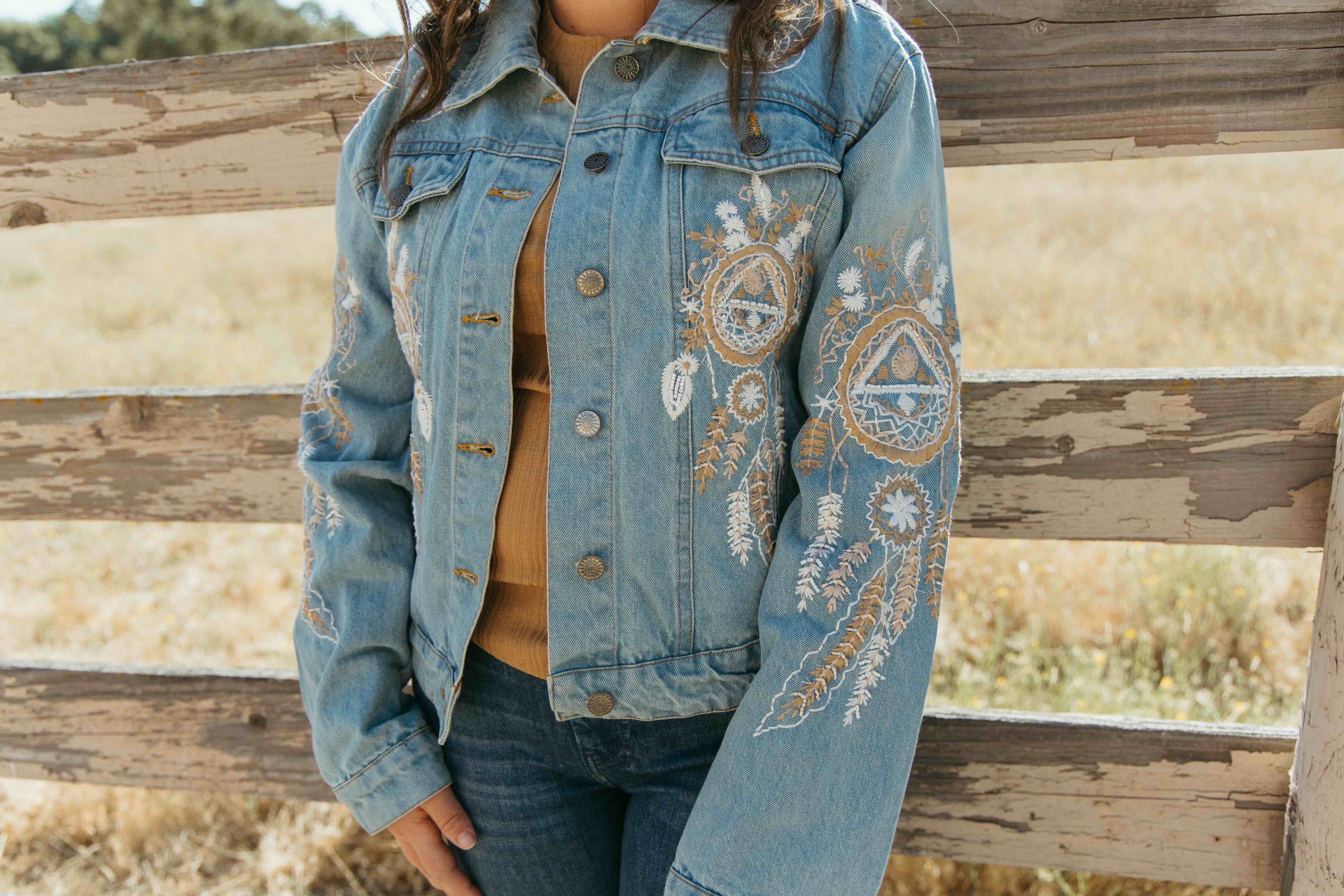 Indulge in luxury with our Dreamer Kat Embroidered Denim Jacket. Hand-crafted by Nu Vintage, each piece features unique embroidered dreamcatcher detailing. The light wash denim adds a touch of vintage charm to this timeless jacket. Own a one-of-a-kind piece today.