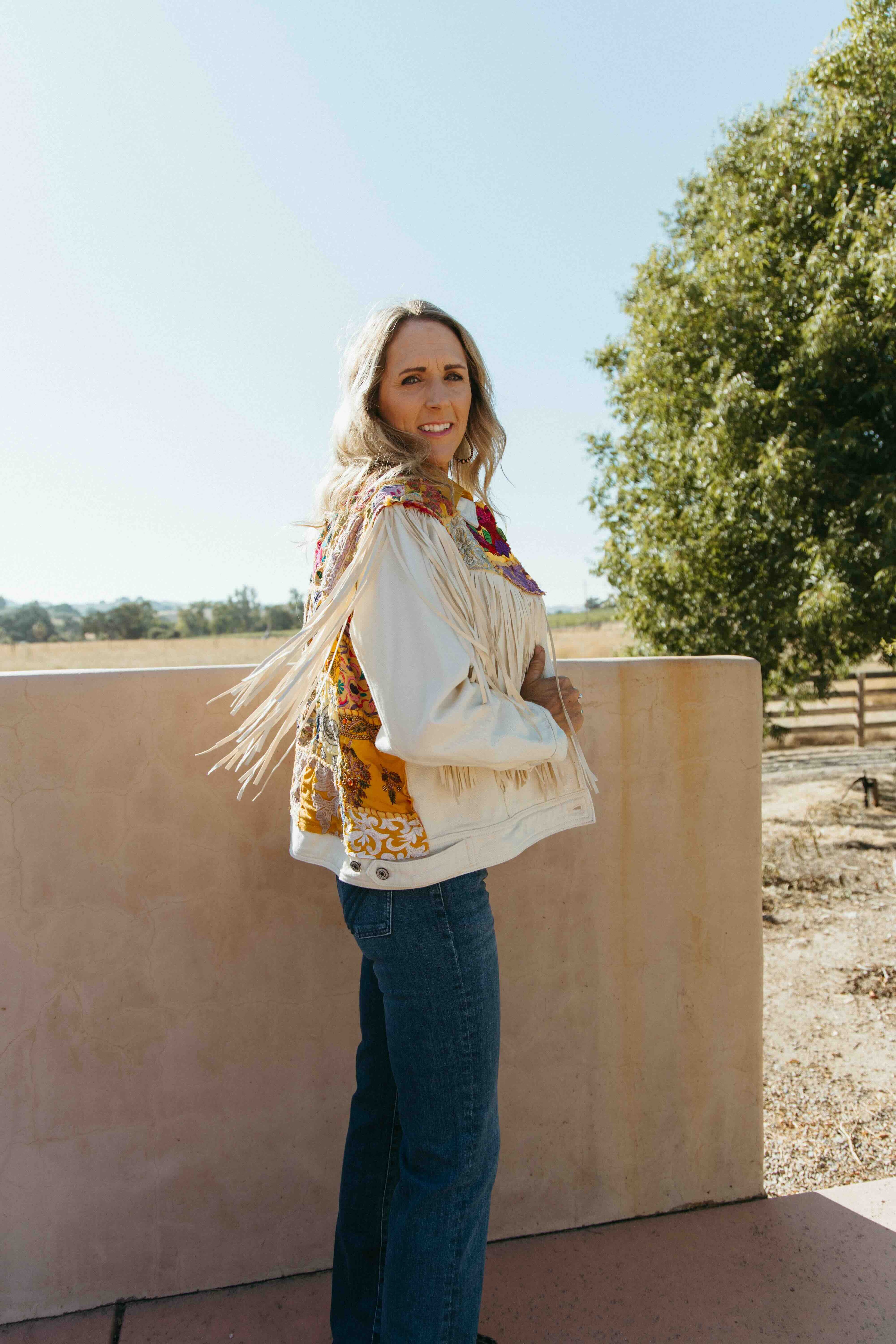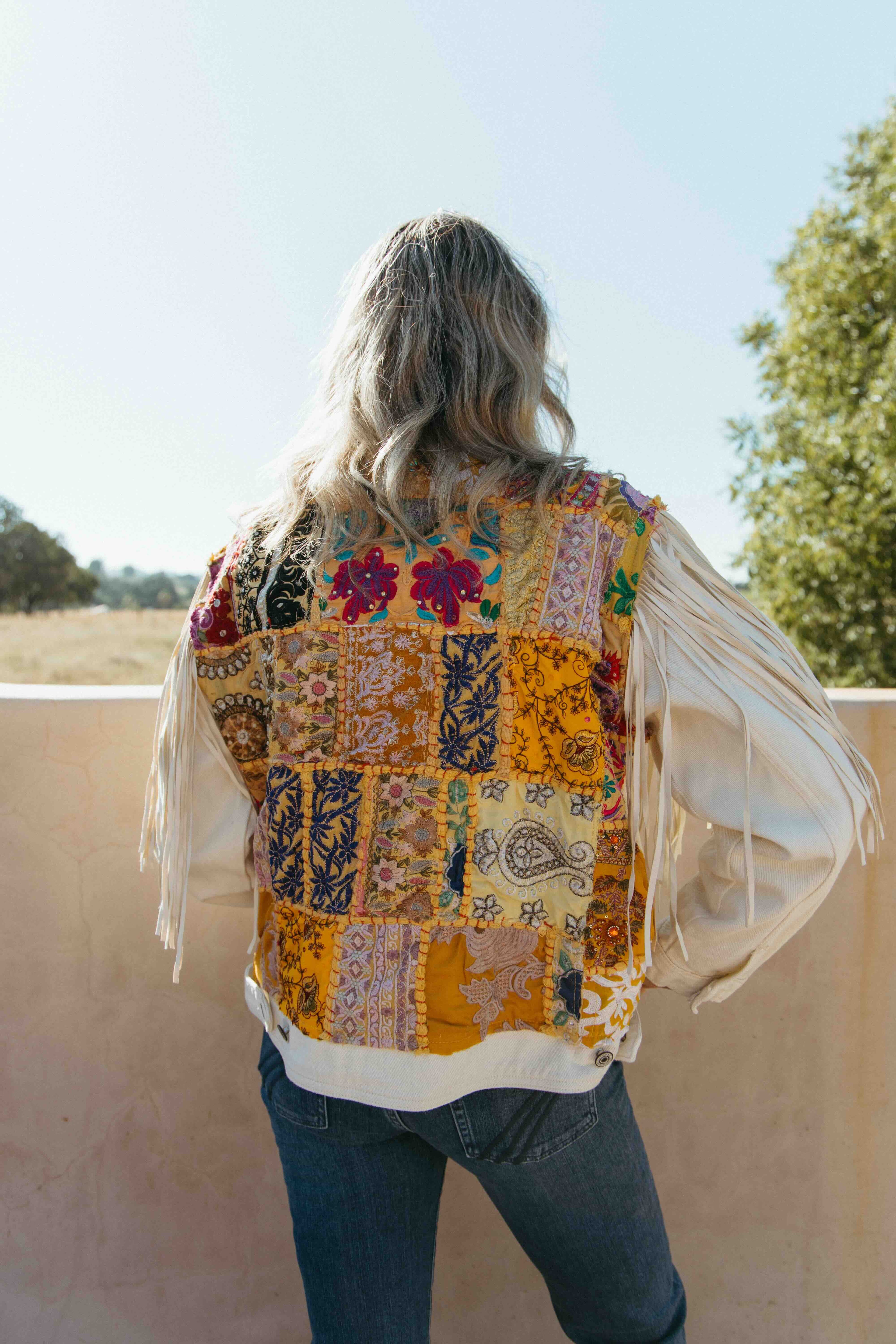 Indulge in ultimate luxury with the Lexy Kat Fringe Jacket. Made with fabric patchwork on the back and shoulders, this jacket boasts a unique and stylish look. The white denim adds a touch of sophistication while the fringe on the shoulders adds a touch of playfulness. Elevate your fashion game with this must-have piece.