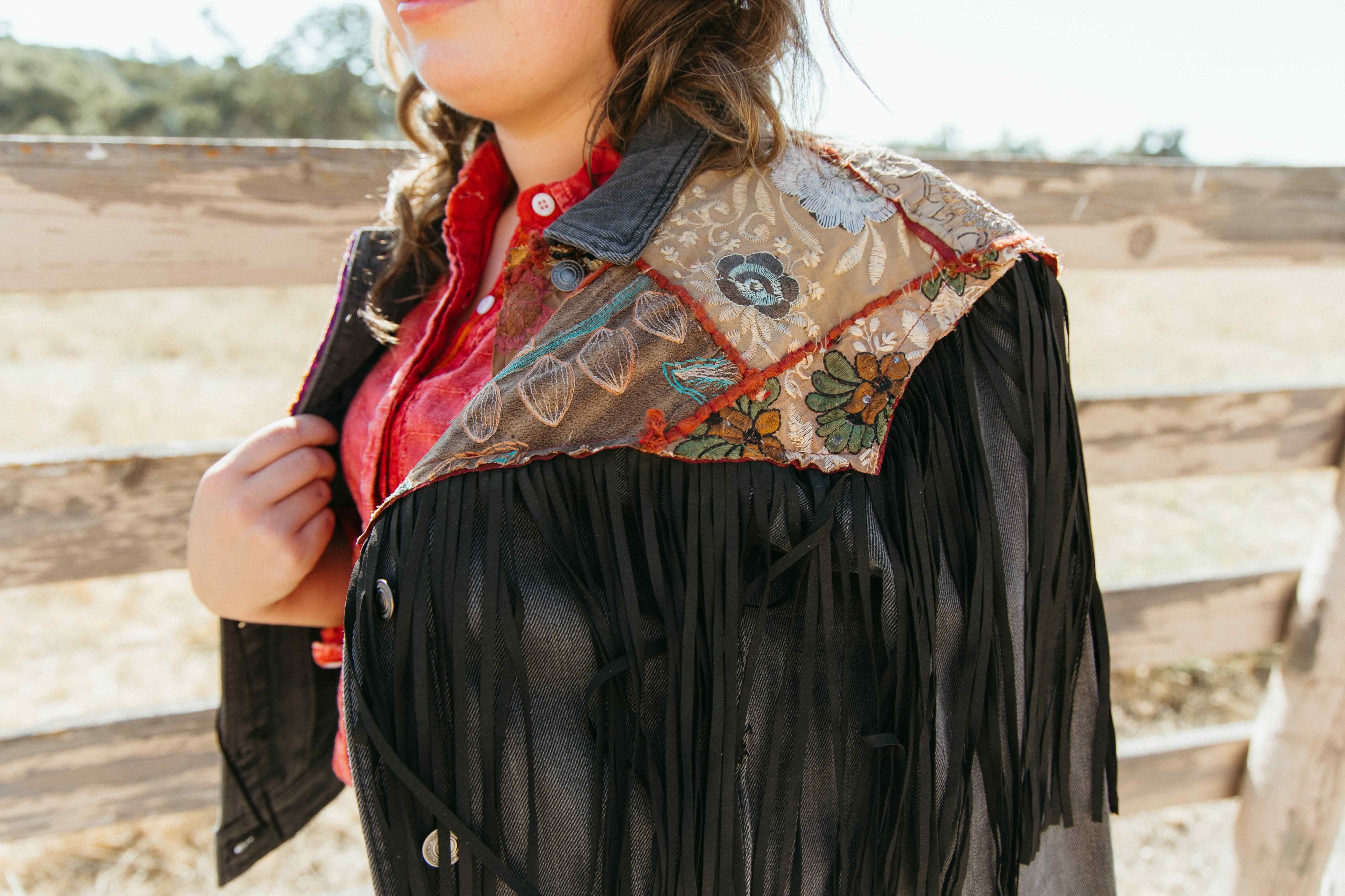 Indulge in luxury with the Vancouver Kat Black Denim Jacket. The white denim fabric patchwork on the back and shoulders adds a unique touch while the playful fringe on the shoulders elevates your style. Sophisticated and stylish, this must-have piece will make you stand out in any crowd.