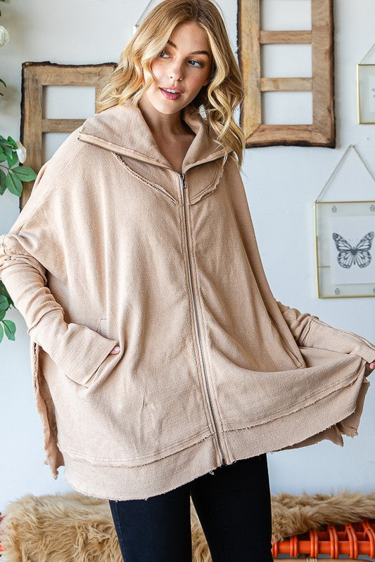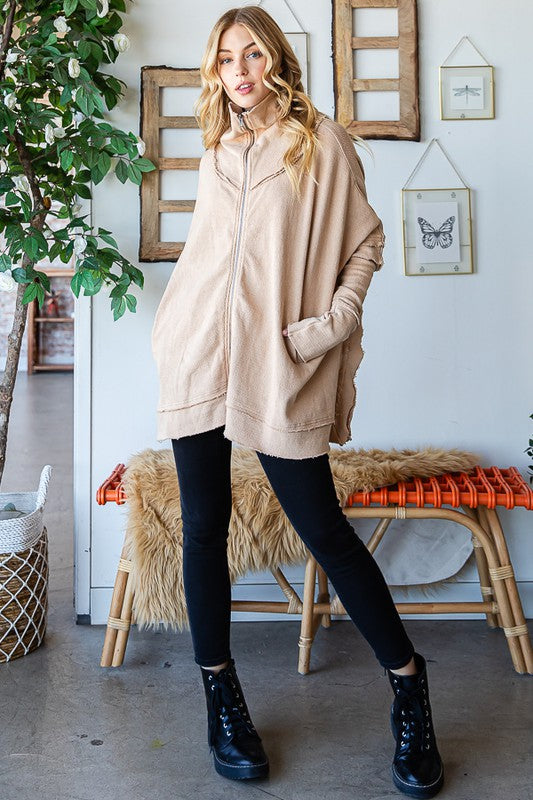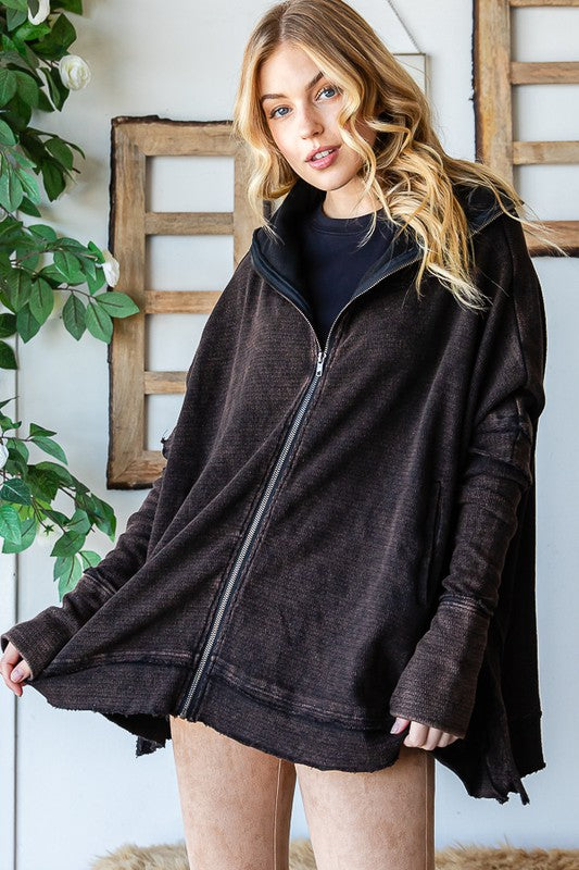 Introducing The Audrey Kat Oversize Collared Zip Up! This washed turtle neck poncho is the perfect way to stay cozy and stylish this season. With its oversized fit and unique collar, you'll be turning heads with every wear.