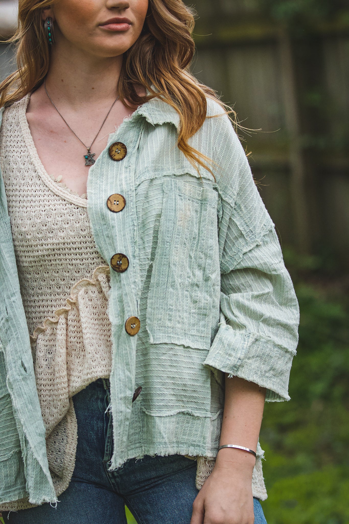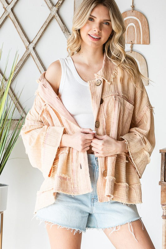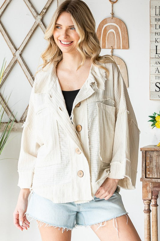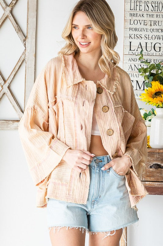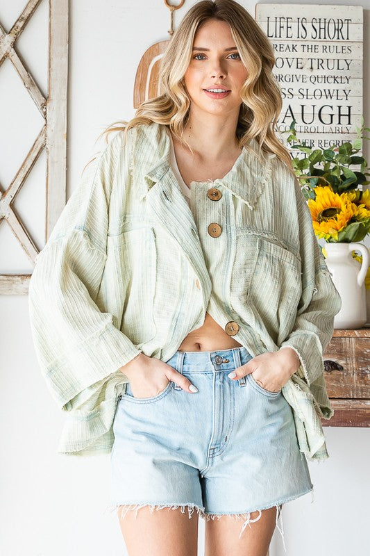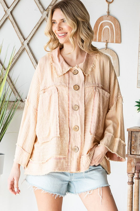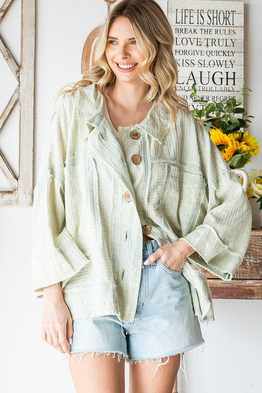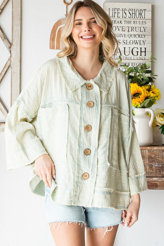 Introducing the Fella Kat Washed Wooden Button Shacket! Get the best of both worlds with a relaxed fit and oversized wooden buttons for that extra touch of style. Step up your fashion game with this unique and playful piece.