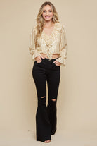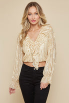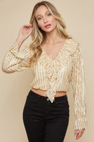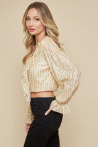 Introducing the Veuve Ruffle Sequin Crop. With long sleeves and a sequined design, this cropped blouse will add a touch of glamour to any outfit. The ruffled v neckline leads to a cascading ruffle feature, creating a chic and feminine look. Perfect for any special occasion or a night out on the town.
