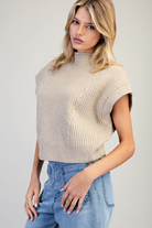 This sleeveless knit top showcases a mock neckline, dropped arm openings, and vertical ribbed texture accented with subtle braided cable knit details, finished with a cropped ribbed hem for a structured yet effortless look.