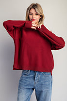 This soft knit sweater features a relaxed boxy silhouette with dropped shoulders, long sleeves, exposed seam detailing, and ribbed trim at the crew neckline, cuffs, and hem finished with subtle side slits and a high-low design for an effortlessly laid back look.