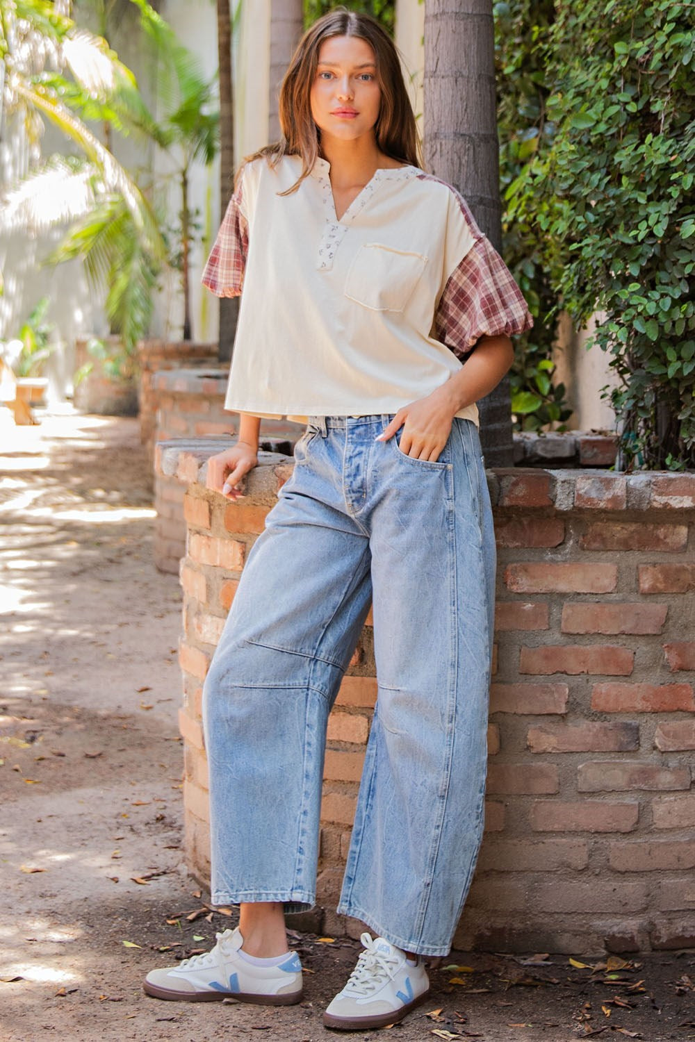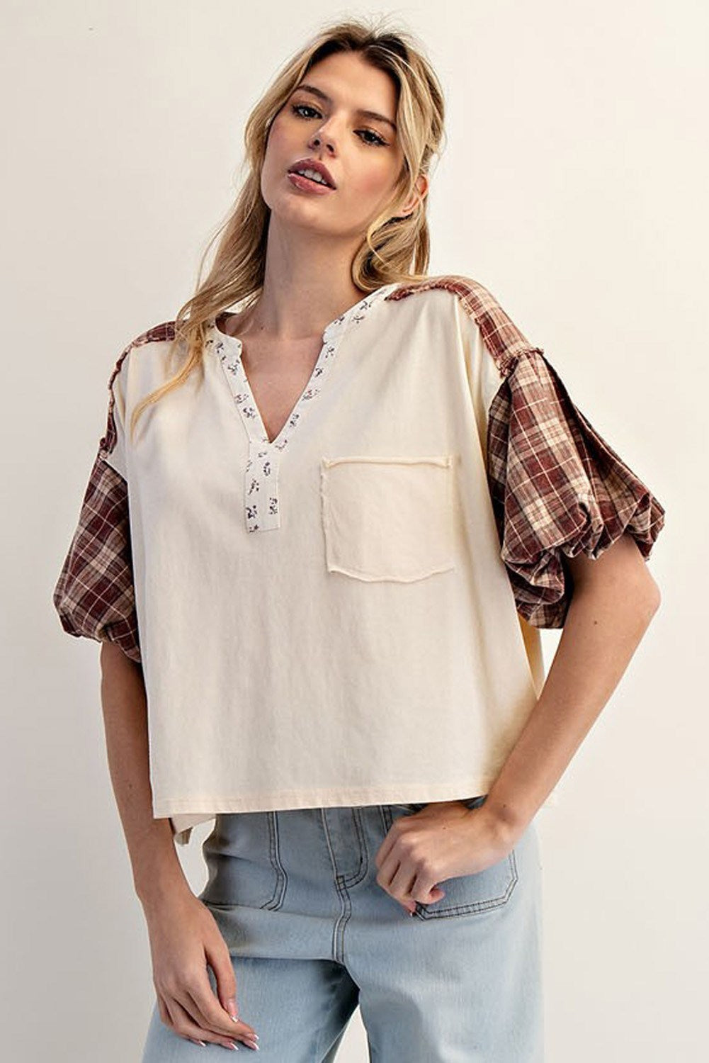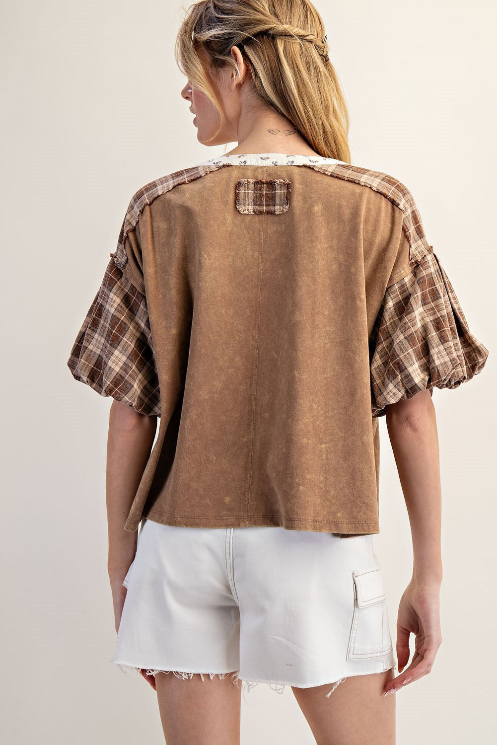Solene Kat Mineral Washed Plaid Puff Sleeve Top