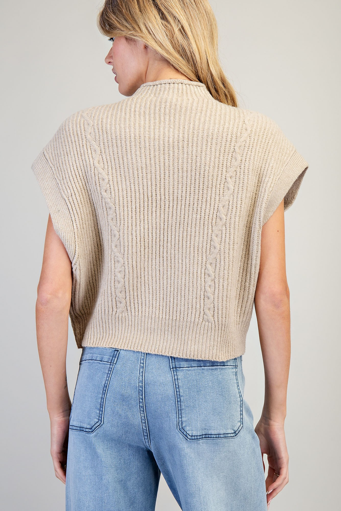 This sleeveless knit top showcases a mock neckline, dropped arm openings, and vertical ribbed texture accented with subtle braided cable knit details, finished with a cropped ribbed hem for a structured yet effortless look.