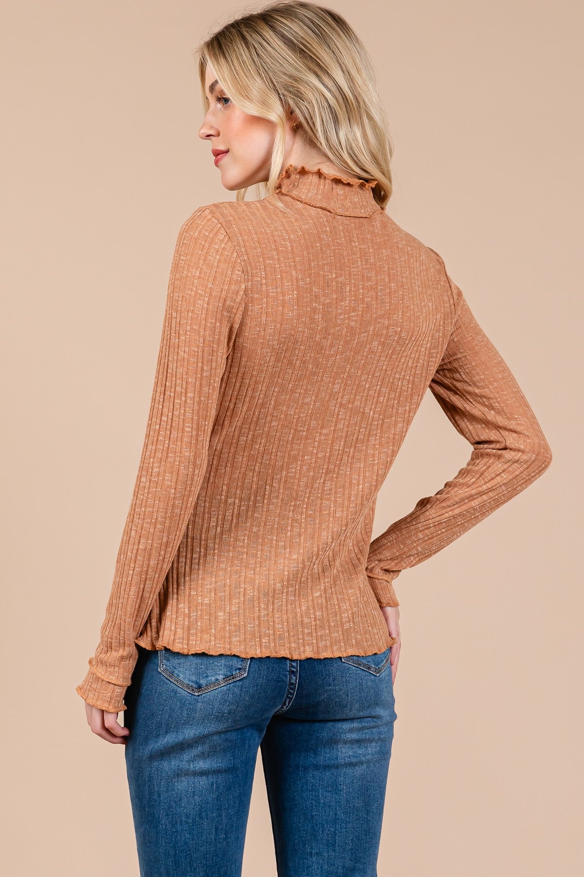 Introducing the Jo Kat Long Sleeve Mock Neck Top, crafted from soft knit fabric with a ribbed texture for a luxurious feel. Featuring a delicate mock neck detail and lettuce marrow detail, this top is the perfect combination of elegance and comfort. Elevate your wardrobe with this must-have piece.