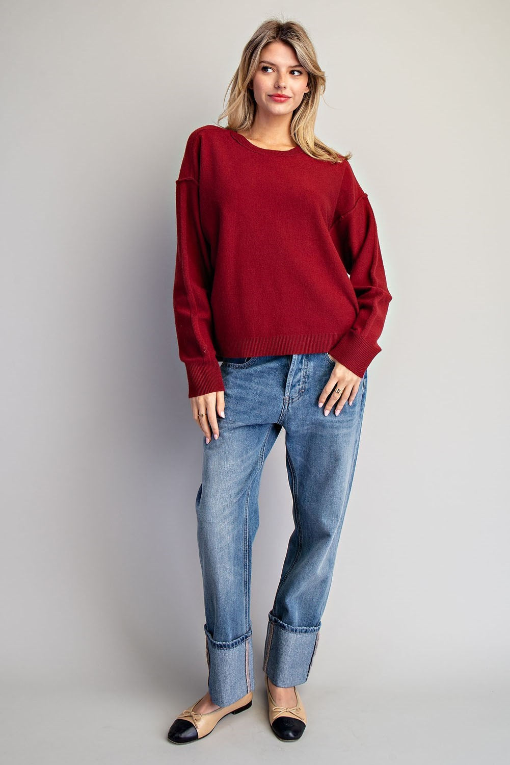 This soft knit sweater features a relaxed boxy silhouette with dropped shoulders, long sleeves, exposed seam detailing, and ribbed trim at the crew neckline, cuffs, and hem finished with subtle side slits and a high-low design for an effortlessly laid back look.