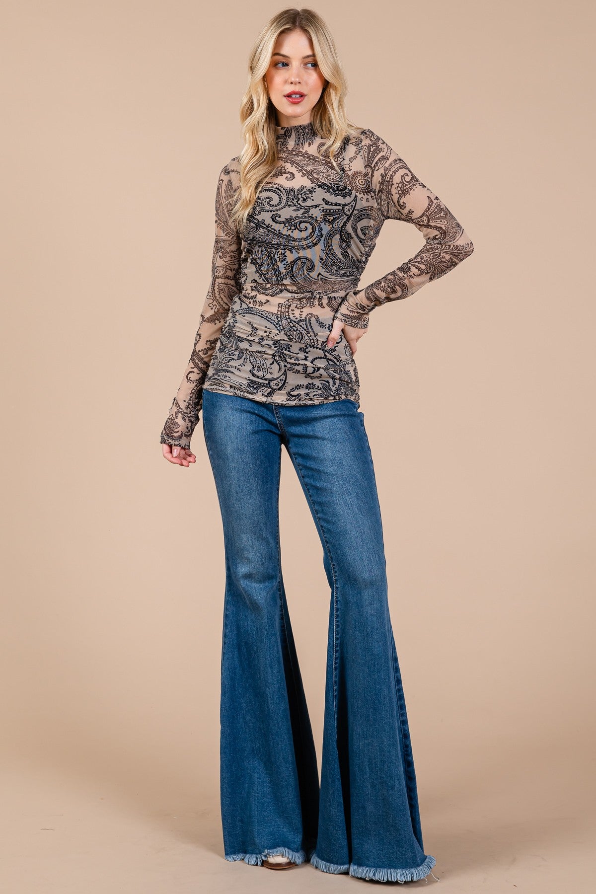 Elevate your style with our Nyx Kat Sheer Paisley Long Sleeve top. This top features a flattering mock neck and a bold paisley print, perfect for adding a touch of sophistication to any outfit. The sheer and stretchy fabric provides comfort and added versatility.