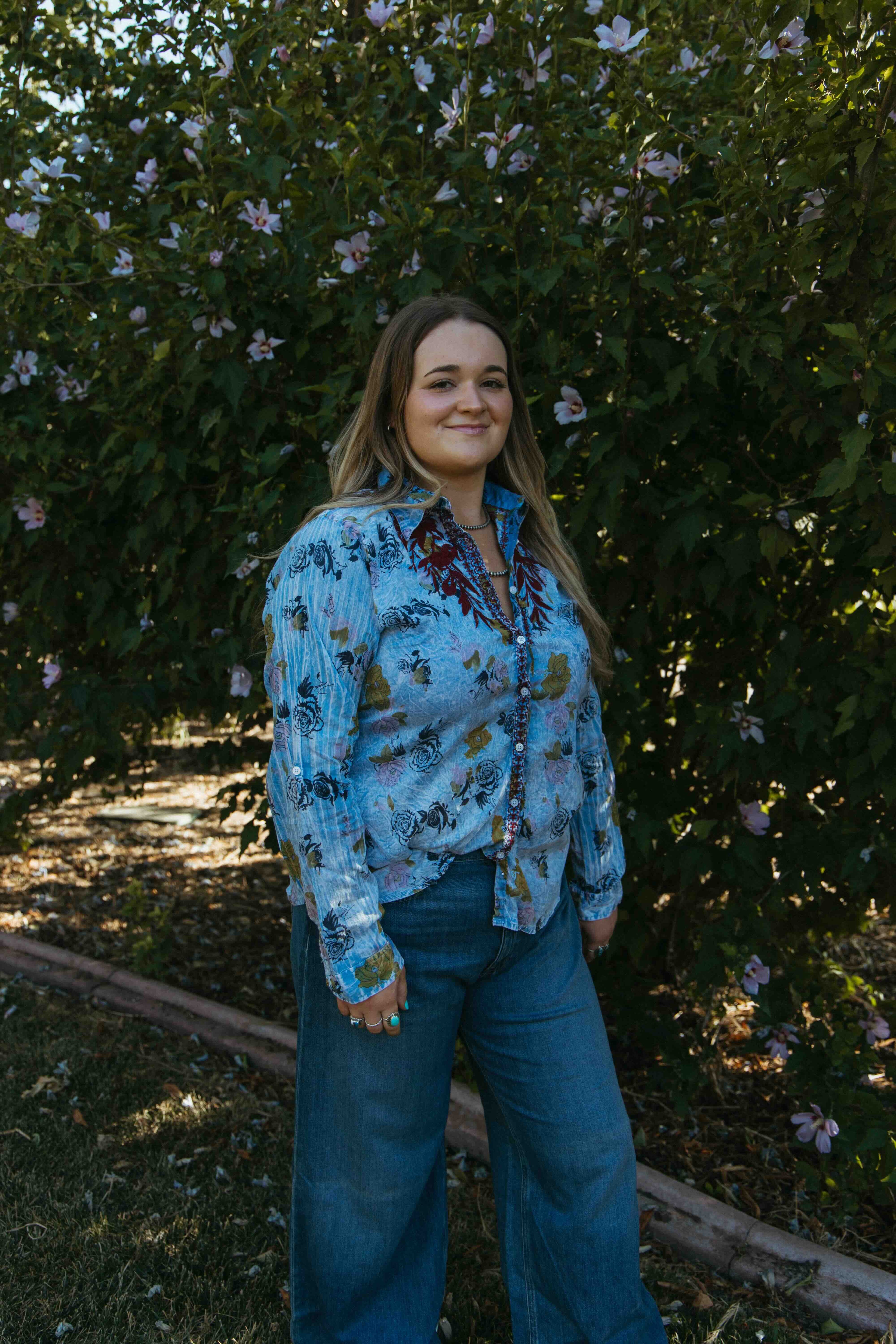 Elevate your style with the Stormy Kat Blue Embroidered Button Up. Featuring a stunning floral pattern in luxurious blue fabric, this show shirt exudes sophistication. The intricate red thread embroidered florals on the front add a touch of elegance to your look.