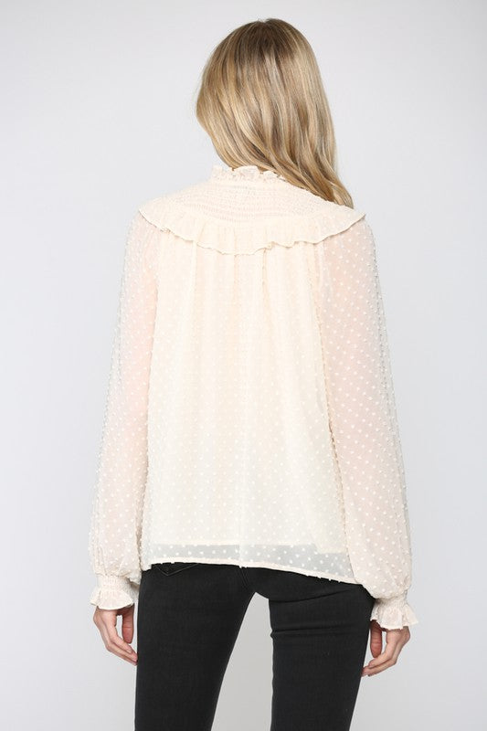 Introducing the Kinlie Kat Smocked Top Blouse, featuring a delicate smocked yolk design and a soft swiss dot chiffon fabric. Elevate your wardrobe with this elegant blouse, perfect for any occasion.