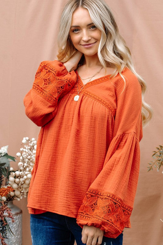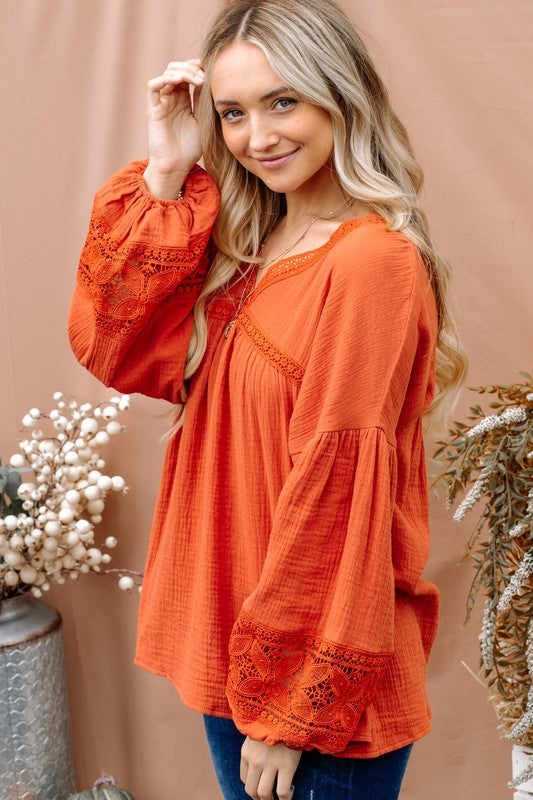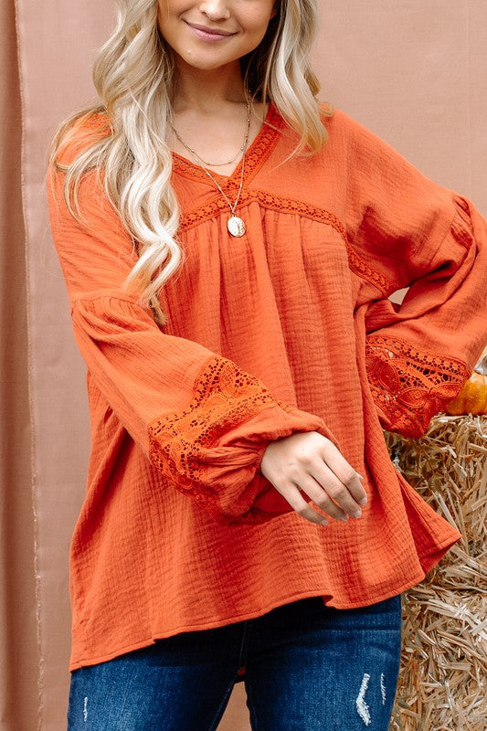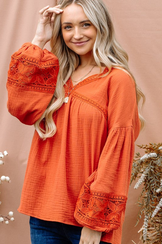 Experience the perfect blend of comfort and style with The Marx Cotton Gauze Lace Balloon Sleeve Top. Made from soft cotton gauze fabric, this top features beautiful lace detailing and trendy balloon sleeves. Elevate your wardrobe with this must-have piece.