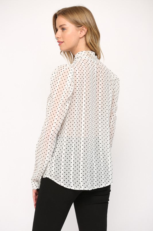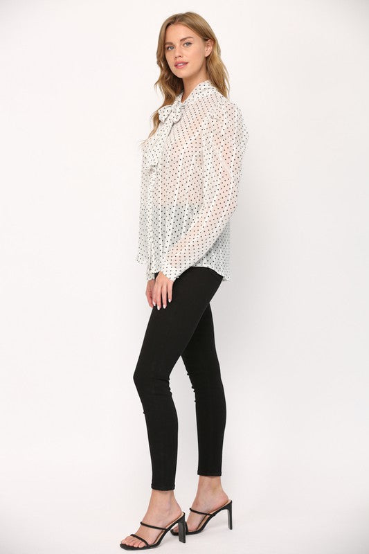 Elevate your wardrobe with the Mellie Kat Neck Tied Blouse. This stunning blouse features a playful polka dot pattern accented with shimmering lurex, adding a touch of glamour to any outfit. The elegant tie neck detail adds a feminine touch, making this blouse a must-have for any fashion-forward individual.
