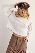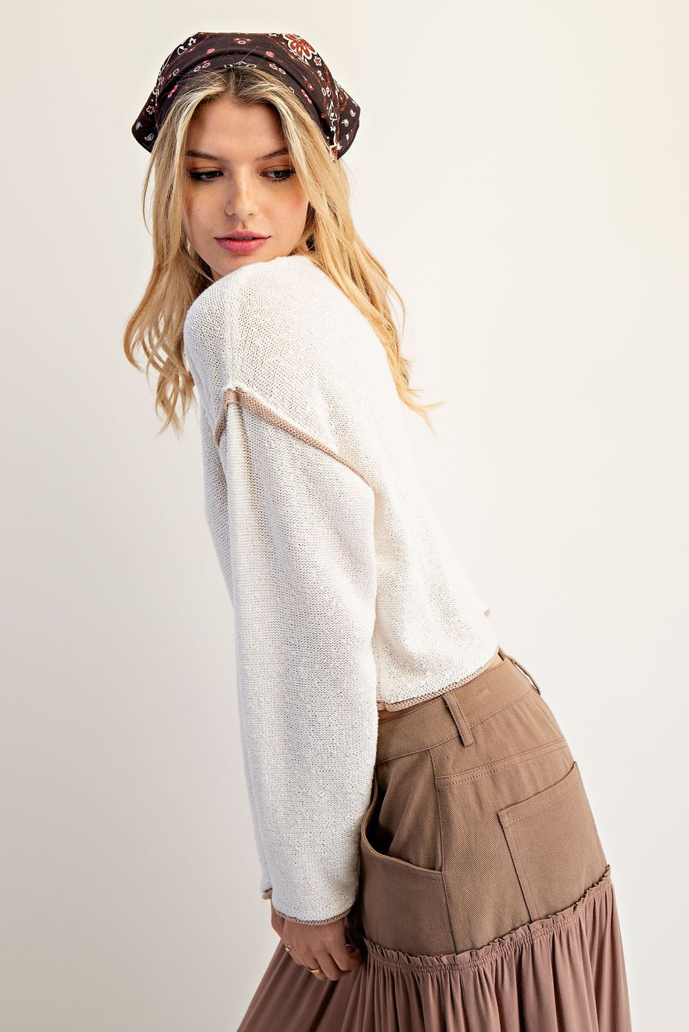 This long sleeve knit top features a textured open weave, exposed contrast seam detailing along the dropped shoulders and edges, a wide crew neckline, and a relaxed cropped hem for an easygoing and effortless finish.