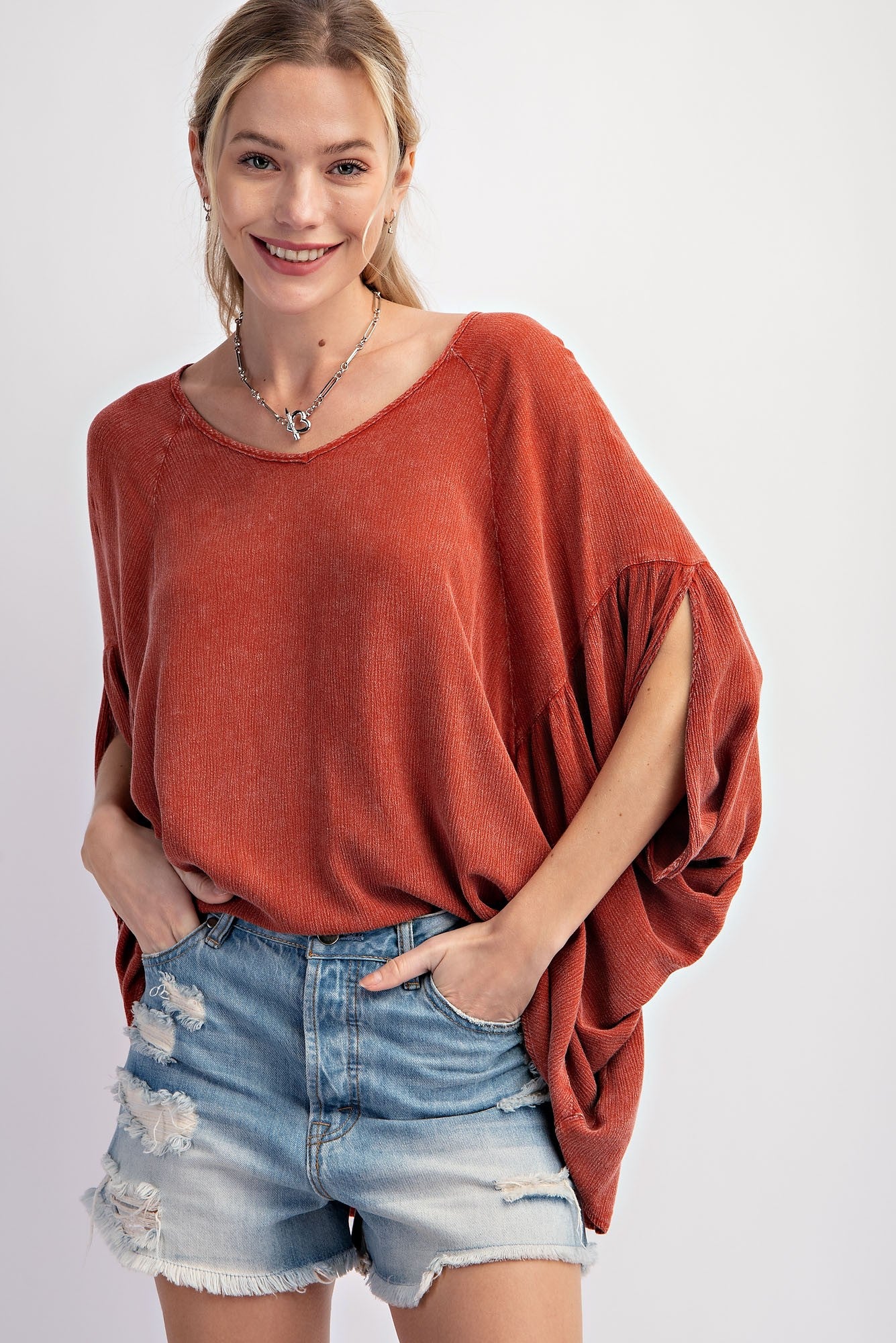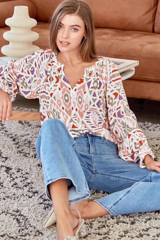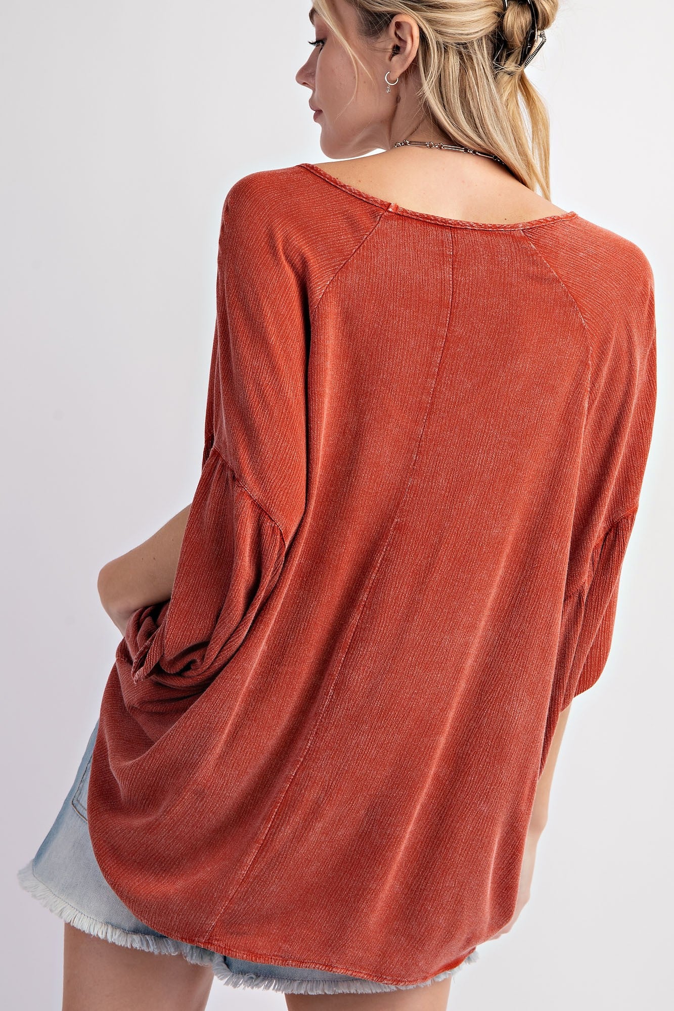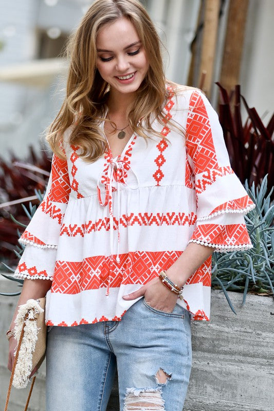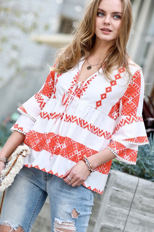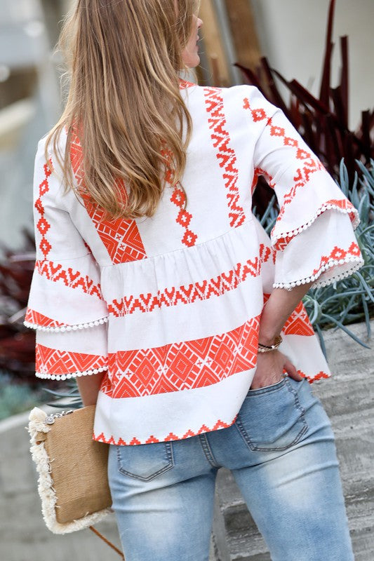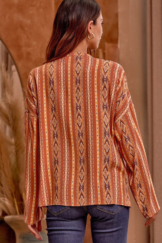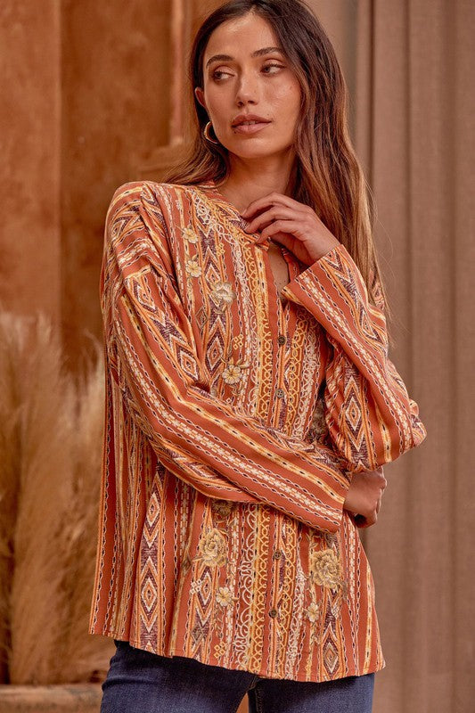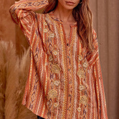 The Wren Kat Split Neck Rust Stripe Embroidered Top Curve +