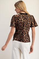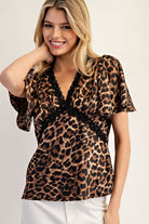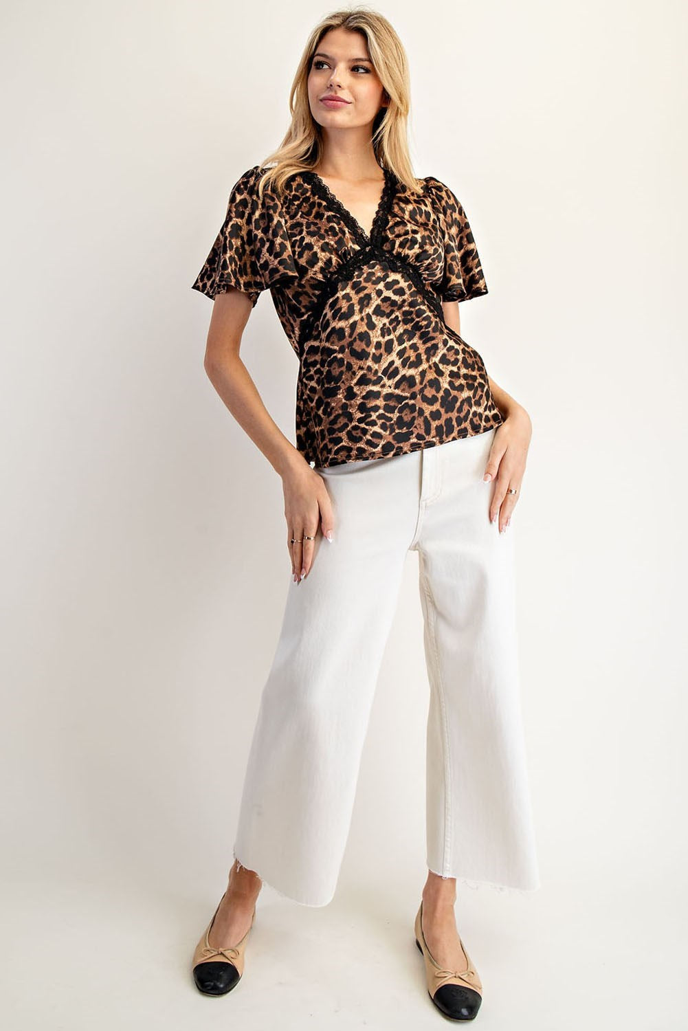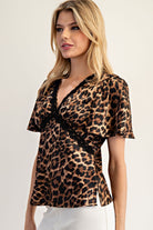 This satin leopard print top features a flattering V-neckline trimmed in delicate black lace, pinched shoulders, short flutter sleeves, and gathered bust seams for a bold yet feminine silhouette.