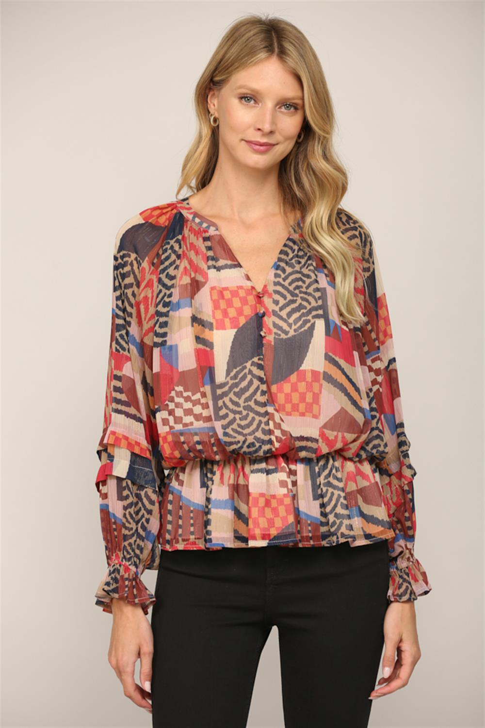 The Matera Chiffon Shirred Waist Blouse features an abstract print that combines navy, red, and brown colors. The shirred waist adds a flattering touch while the lightweight lurex chiffon material brings a touch of elegance. Effortlessly elevate your wardrobe with this versatile piece.